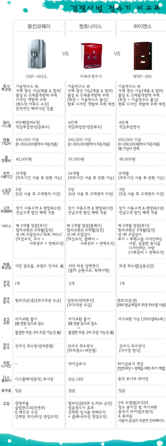 웅진이 은근히 비싸더라구요. 렌탈서비스에 대해 안좋은 얘기도 있는것 같고..