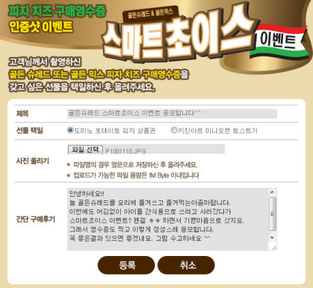 응모방법이 위 사진처럼 구매영수증을 찍어서 핸드폰으로 보내거나 홈페이지에 올리거나 택1이었는데, 저는 핸드폰으로 찍어서 상하치즈 홈페이지에 직접 올렸답니다.