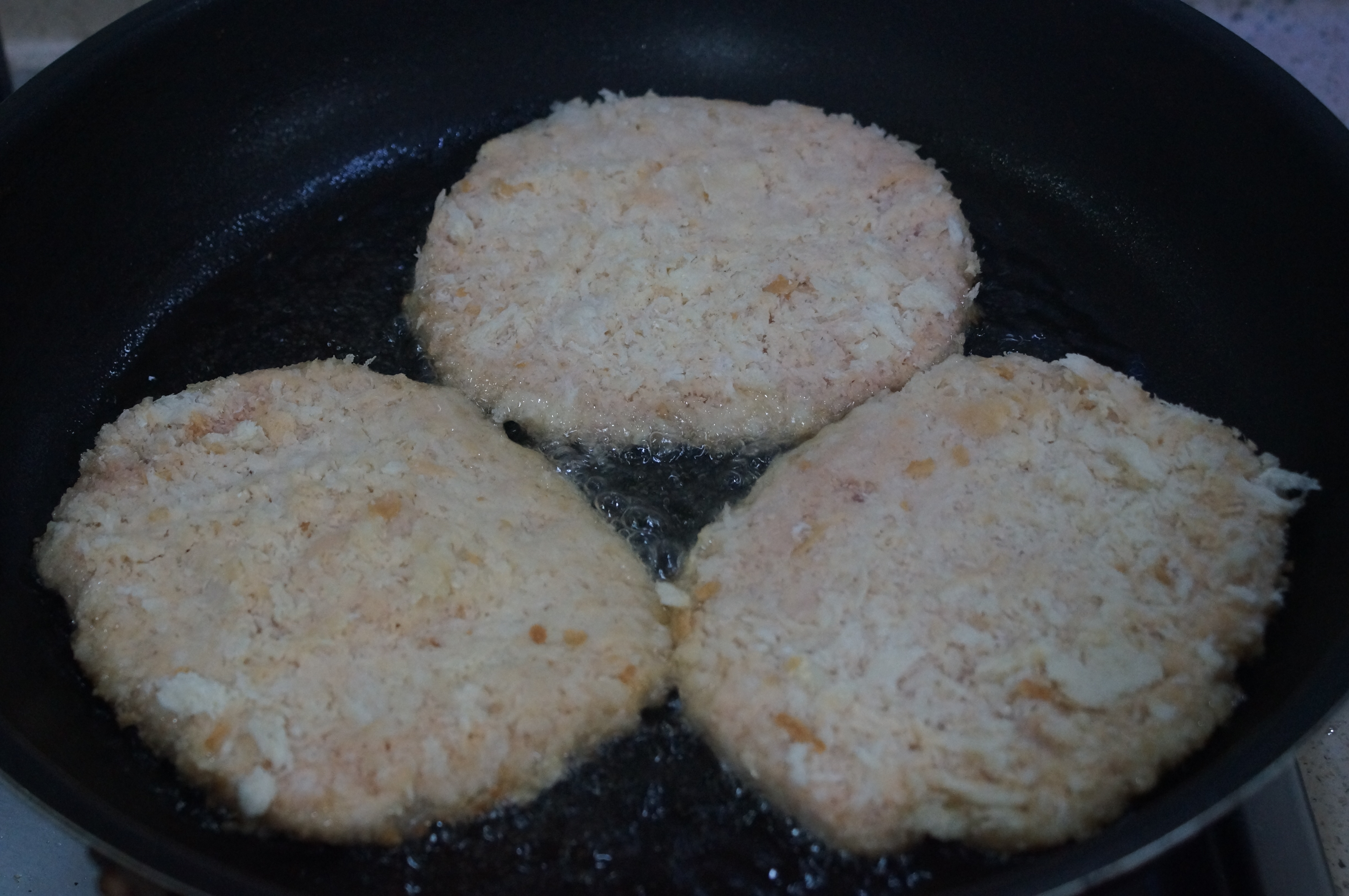 3. 돈까스를 굽기위해 후라이팬에 기름을 넉넉히 두르고 구웠습니다.