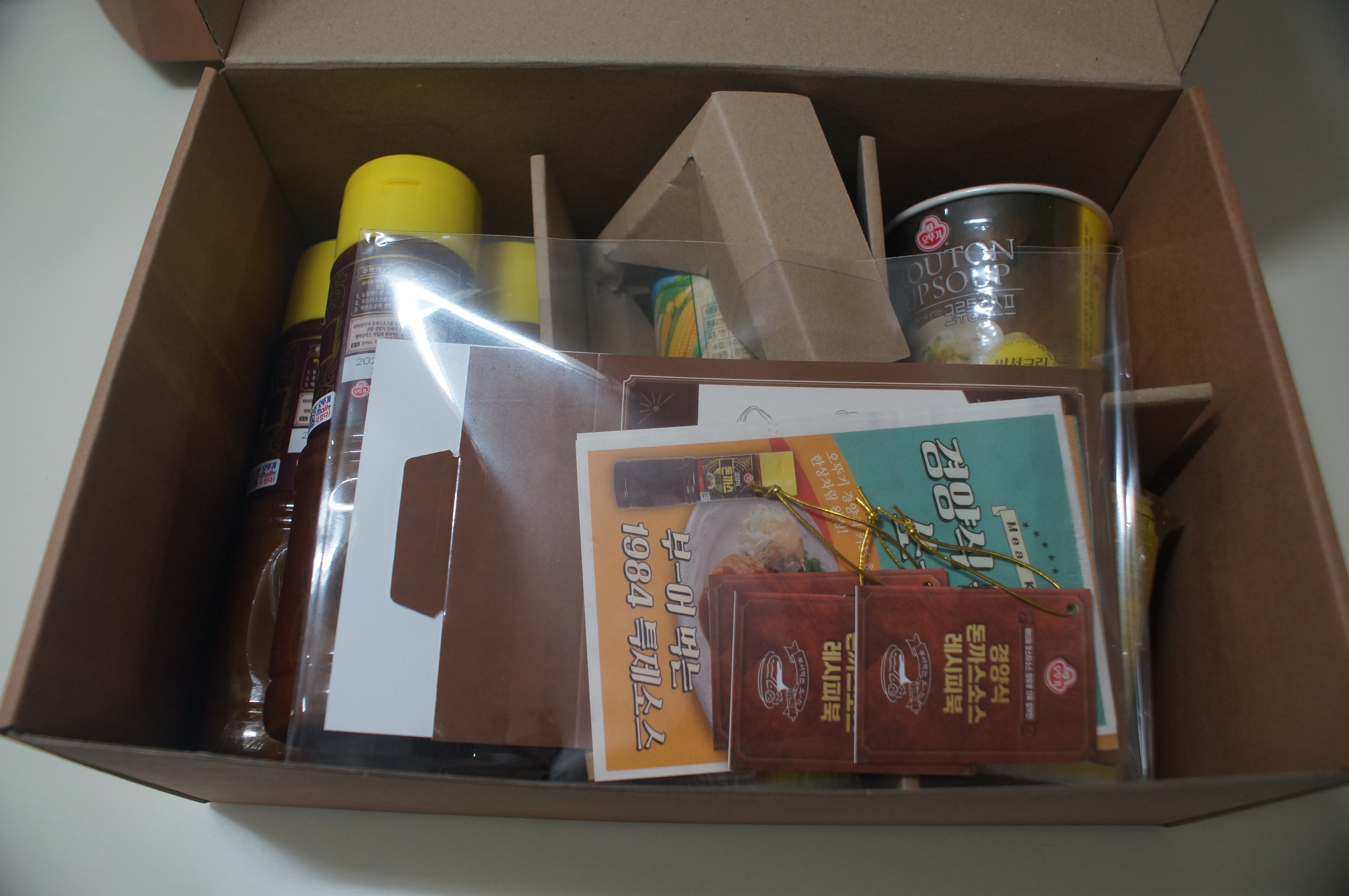 이중 한박스안엔 이렇게 돈까스소스, 스위트콘, 크루통스프, 각종 안내문 등이 들어있었어요.