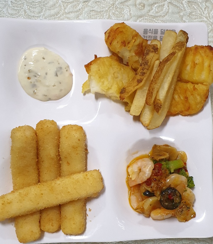 새우감바스는 밖에서 사먹는 맛과 비슷했어요~ 먹어도 살 안찔꺼 같은 기분이 드는 안주였네요~ 치즈스틱은 에어프라이어로 조리후 다시 기름을 조금 쳐서 후라이팬 으로 조리해서 더 맛있었던거 같아요.. 개인적으로는 에어프라이어 보다는 후라이팬 조리 추천이구요~ 피쉬앤칩스는 대구살이 꽉차 있어 마치 명절때 전 먹는 느낌이었네요..